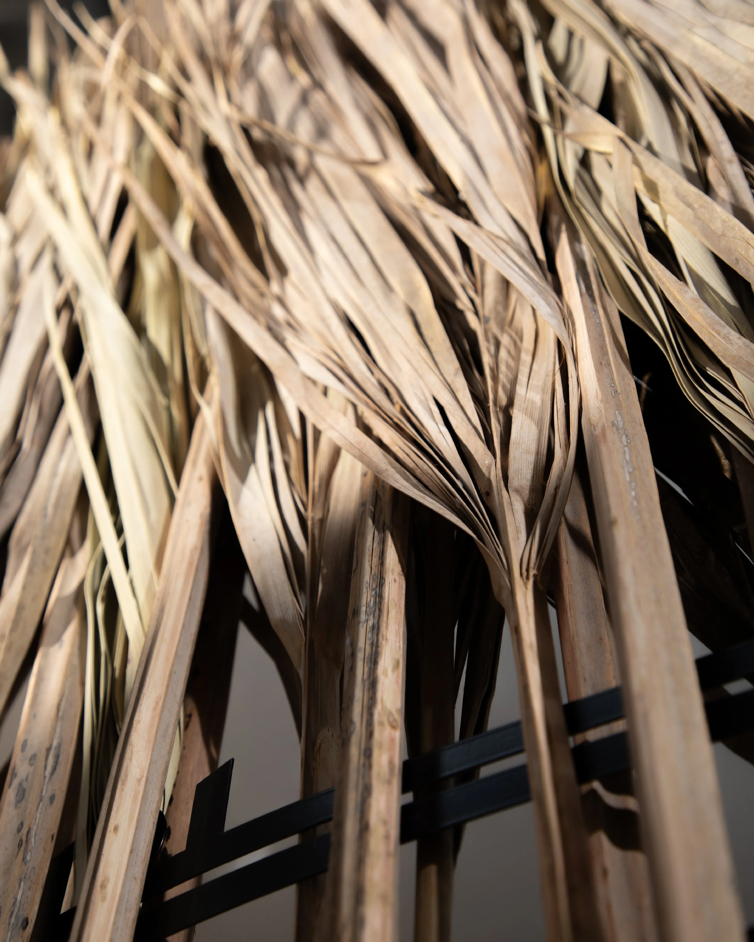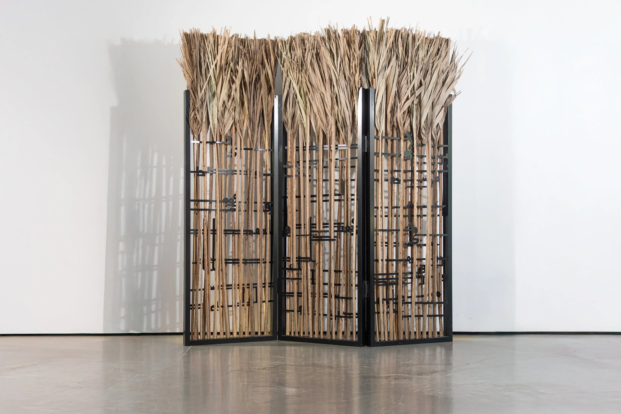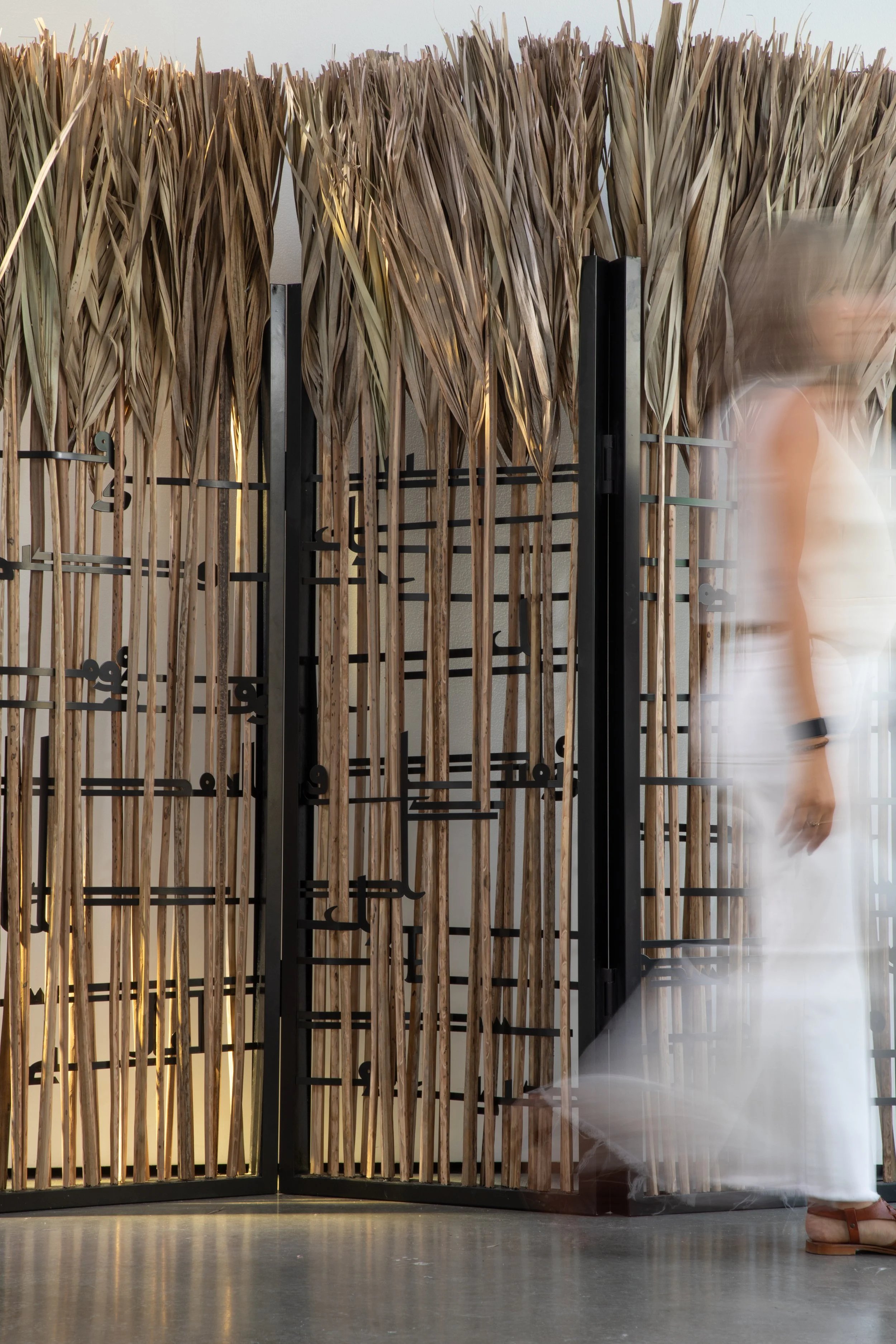 Sitr is a freestanding typographic room divider that bridges memory, architecture, and poetics. Prototype A is composed of three vertical panels that form a quiet threshold between interior and exterior, past and present — weaving together function and narrative in a tactile, living object. Strips of dried palm fronds form the vertical warp, interlaced with metal text fragments — poetry, storytelling, and remembered speech — creating a woven surface that reads like a page of memory.