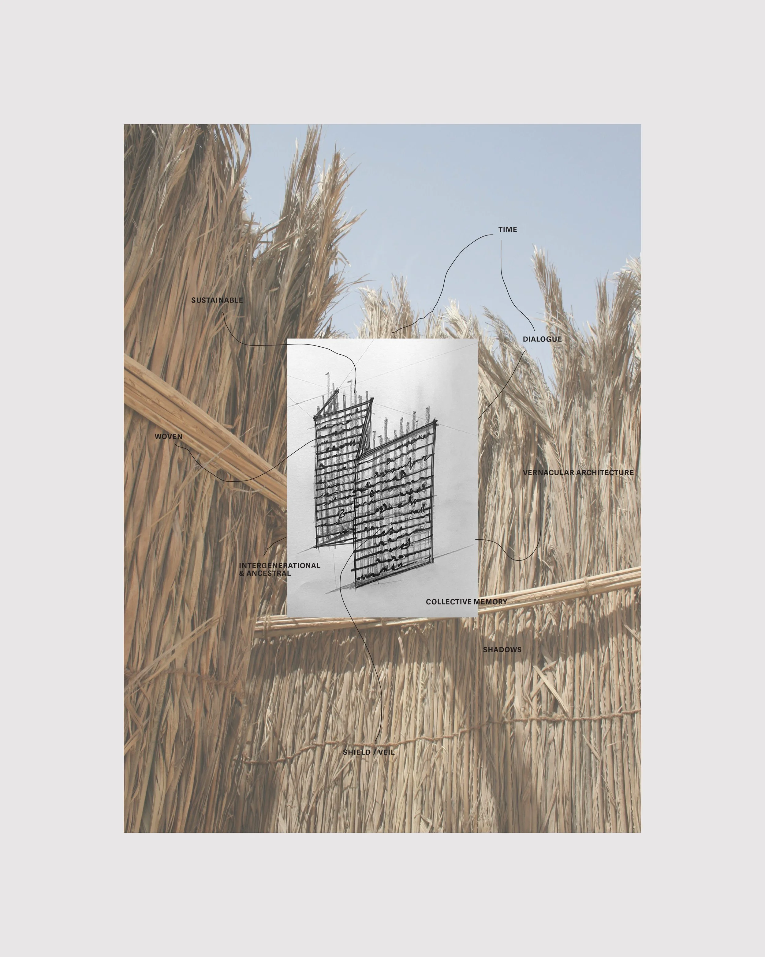 Drawing inspiration from my grandmother’s paravan in Damascus and regional Areesh structures, Sitr breathes with its surroundings, carrying stories through material and form. Rooted in both craft and language, its title Sitr (ستر) relates to stara (ستارة) — the curtain or veil — an object of concealment and revelation. In Damascus, such a divider is affectionately called a paravan, borrowed from the French paravent, reflecting how language, like craft, travels and transforms. Within these crossings — of word, material, and space — Sitr becomes a vessel for storytelling, listening, and resonance across generations and travel.